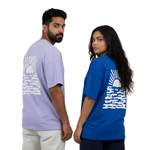 Capture calm coastal vibes with the Minimal Sun & Waves Oversized T-Shirt. Its bold hand-drawn sunrise over water adds an artistic and serene look.
