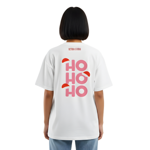 Add a fun and cheerful vibe to your holiday wardrobe with the “HO HO HO” Oversized Christmas T-Shirt designed in bold pink lettering and Santa hat accents.